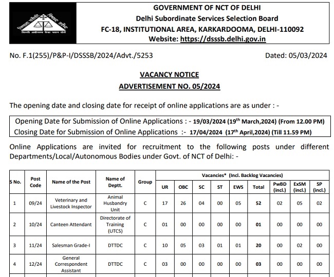 दिल्ली पर्यटन एवं यातायात विकास निगम लिमिटेड (DTTDC) नई दिल्ली नगर निगम (NDMC) दिल्ली नगर निगम (MCD) महिला एवं बाल विकास विभाग (WCD) और अन्य विभागों व निगमों में ग्रुप बी और ग्रुप सी के कुल 1499 पदों पर भर्ती (DSSSB Recruitment 2024) के लिए आवेदन 19 मार्च 2024 से आमंत्रित किए जा रहे हैं। आवेदन प्रक्रिया आज 17 अप्रैल की रात 11.59 बजे समाप्त होने जा रही है।