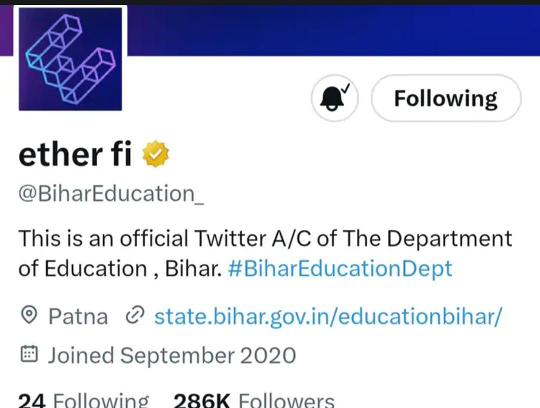 बिहार के शिक्षा विभाग का ऑफिसियल एक्स अकाउंट हैक कर लिया गया है। हैकरों ने अकाउंट का नाम बदलकर ether fi रख दिया है। इस कांड के बाद सभी अधिकारियों के होश उड़ गए हैं। फिलहाल यह पता नहीं चल पाया है कि अकाउंट को किसने हैक किया है। हालांकि अकाउंट पर अभी तक हैकरों की तरफ से कोई पोस्ट नहीं किया गया है।