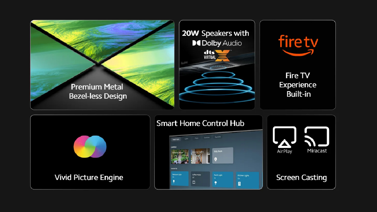 Redmi Fire TV में 32-इंच HD-Ready डिस्पले दिया गया है, जिसका व्यूविंग एंगल 178-डिग्री, ऑटो लो लेटेंसी मोड, 6.5ms रिस्पॉन्स टाइम और 96.9 प्रसेंट स्क्रीन टू बॉडी रेश्यो दिया गया है।