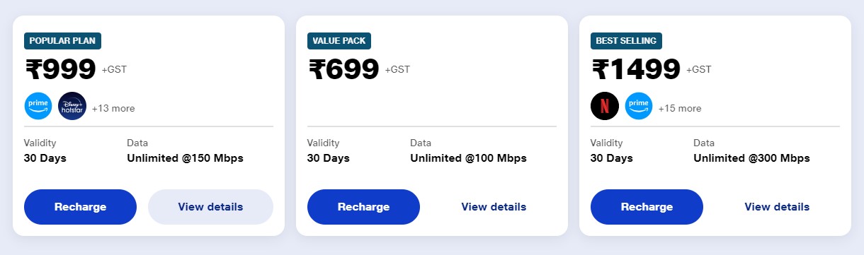 - इस प्लान में 300mbps डाउनलोड स्पीड, अनलिमिटेड वॉयस कॉलिंग और Amazon Prime और Disney+ Hotstar के साथ Netflix (बेसिक) की सुविधा वाला प्रीमियम OTT बंडल मिलता है।