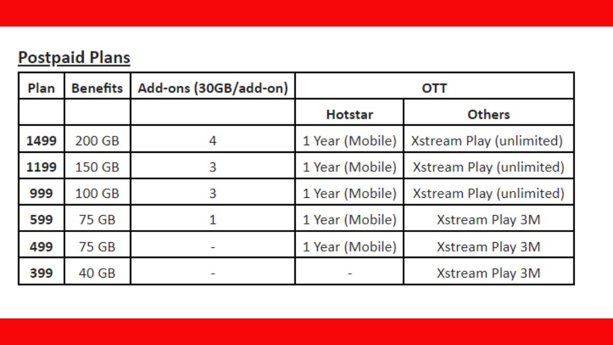 पोस्टपेड प्लान की शुरुआत 499 रुपये से होती है। पैक में एक साल का डिज्नी+ हॉटस्टार सब्सक्रिप्शन, साथ ही एक्सस्ट्रीम ऐप पर 20 से अधिक ओटीटी प्लेटफॉर्म तक पहुंच, अनलिमिटेड 5जी डेटा जैसी सुविधाएं मिलती हैं। यह पैक 75GB डेटा के साथ आता है।