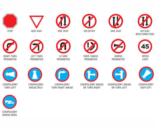 पहली कैटेगरी में आने वाले ट्रैफिक साइन बोर्ड्स अनिवार्य निर्देश या बैन को कम्यूनिकेट करने के लिए होते हैं। ये साइन बोर्ड आमतौर पर व्हाइट बैकग्राउंड और रेड बॉर्डर के साथ राउंड शेप में होते हैं। अगर आप इन संकेतों का पालन नहीं करते हैं, तो आपको संबंधित अधिकारियों के द्वारा दंडित किया जा सकता है। इसमें वन वे, नो एंट्री, स्पीड लिमिट जैसे संकेत शामिल होते हैं।