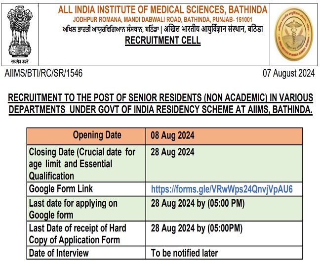 AIIMS Recruitment 2024: एम्स बठिंडा में सीनियर रेजिडेंट नॉन एकेडमिक पदों पर निकली भर्ती, इस डेट तक भर सकते हैं फॉर्म