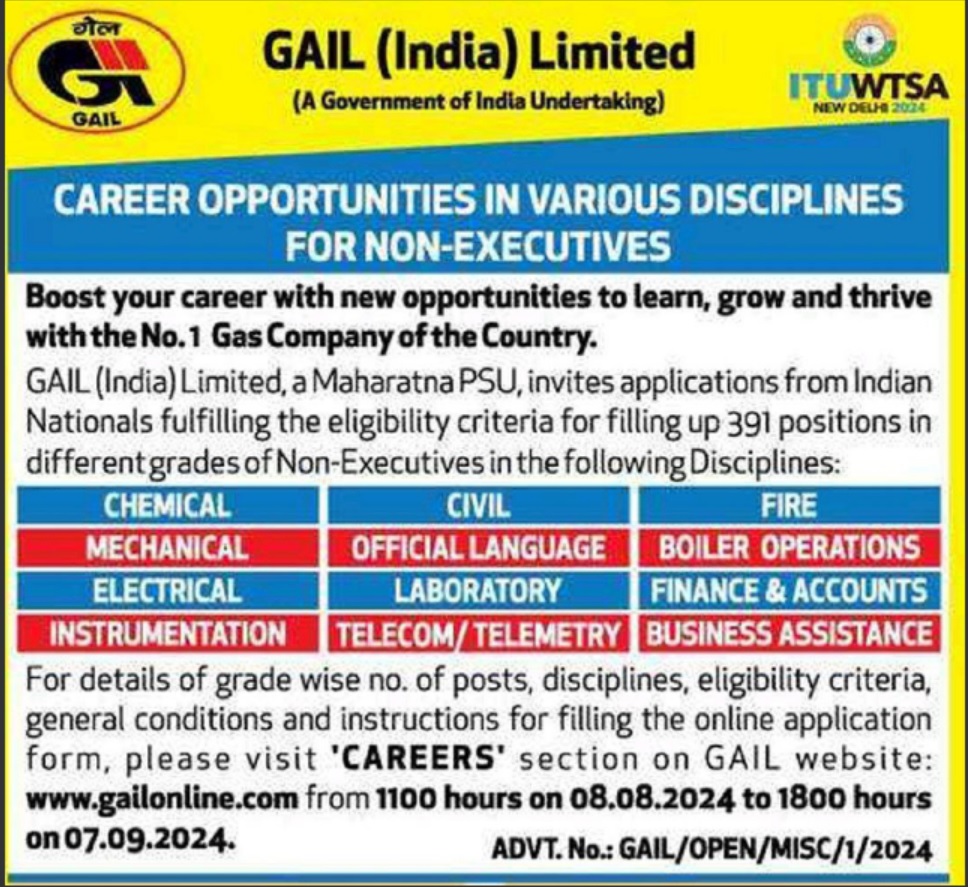 गेल में सरकारी नौकरी के इच्छुक उम्मीदवारों के लिए काम की खबर। भारत सरकार के सार्वजनिक क्षेत्र के उपक्रमों (PSU) में से एक तथा महारत्न कंपनी गेल (इंडिया) लिमिटेड ने नॉन-एग्जीक्यूटिव कैडर में विभिन्न ग्रेड के कुल 391 पदों पर भर्ती के लिए संक्षिप्त अधिसूचना जारी की है। कंपनी द्वारा प्रकाशित विज्ञापन (सं.GAIL/Open/Misc/1/2024) के अनुसार केमिकल, मेकेनिकल, इलेक्ट्रिकल, इंस्ट्रूमेंटेशन, सिविल, आधिकारिक भाषा, प्रयोगशाला, टेलीकॉम/टेलीमेट्री, फायर, बॉयर ऑपरेशंस, बिजनेस असिस्टेंट और फाइनेंस एण्ड एकाउंट्स में विभिन्न पदों पर भर्ती (GAIL Non Executive Recruitment 2024) की जानी है।