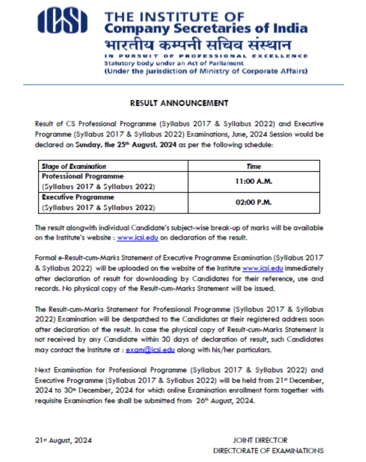 ICSI CS एग्जीक्यूटिव और प्रोफेशनल जून 2024 परीक्षाओं में सम्मिलित हुए स्टूडेंट्स के लिए बड़ी खबर। भारतीय कंपनी सचिव संस्थान (ICSI) ने कंपनी सेक्रेट्री प्रोफेशनल प्रोग्राम (सिलेबस 2017 और सिलेबस 2022) तथा कंपनी सेक्रेट्री एग्जीक्यूटिव प्रोग्राम (सिलेबस 2017 और सिलेबस 2022) के लिए जून 2024 सत्र की आयोजित की गई परीक्षाओं के परिणाम घोषित किए जाने की तिथि का ऐलान कर दिया है। संस्थान द्वारा बुधवार, 21 अगस्त को जारी आधिकारिक सूचना के मुताबिक सीएस प्रोफेशनल और एग्जीक्यूटिव के दोनों सिलेबस की परीक्षाओं के नतीजे रविवार, 25 अगस्त को घोषित किए जाएंगे।