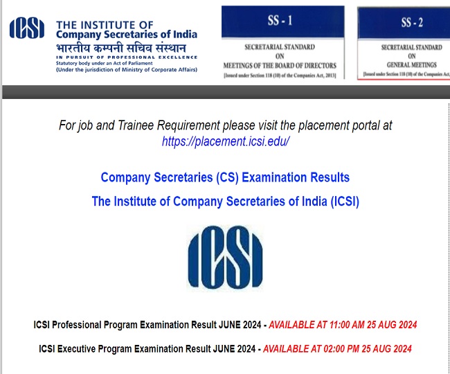 भारतीय कंपनी सचिव संस्थान (ICSI) की ओर से प्रोफेशनल प्रोग्राम का रिजल्ट घोषित कर दिया गया है। ICSI CS प्रोफेशनल जून 2024 परीक्षा में भाग लेने वाले अभ्यर्थी नतीजे जारी होने के बाद अब ऑनलाइन माध्यम से ऑफिशियल वेबसाइट icsi.edu पर जाकर रिजल्ट चेक कर सकते हैं। आपकी सहूलियत के लिए इस पेज पर भी रिजल्ट का डायरेक्ट लिंक उपलब्ध करवा दिया गया है जिसपर क्लिक करके आप आसानी से परिणाम की जांच कर सकते हैं। ICSI CS एग्जीक्यूटिव प्रोग्राम के नतीजे दोपहर 2 बजे जारी कर दिए जाएंगे।