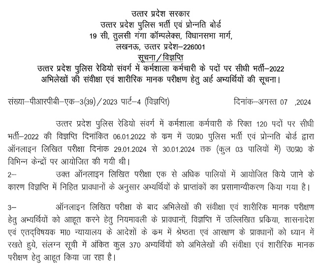 उम्मीदवारों को बता दें कि लिखित परीक्षा के माध्यम से वर्कशॉप स्टाफ (यूपी पुलिस रेडियो कैडर) कुल 370 उम्मीदवारों को शॉर्टलिस्ट किया गया है। इन उम्मीदवारों को अब डॉक्यूमेंट वेरिफिकेशन एवं फिजिकल स्टैंडर्ड टेस्ट (DV & PST) में शामिल होना होगा। इसके लिए जल्द ही शेड्यूल अलग से जारी किया जाएगा। भर्ती से जुड़ी अधिक डिटेल के लिए अभ्यर्थी ऑफिशियल वेबसाइट पर विजिट कर सकते हैं।