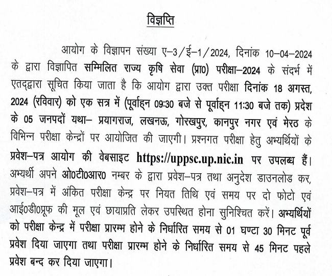 सम्मिलित राज्य कृषि सेवा (प्रा.) परीक्षा 2024 प्रदेश के पांच जनपदों- प्रयागराज, गोरखपुर, लखनऊ, कानपुर नगर एवं मेरठ के विभिन्न परीक्षा केंद्रों पर आयोजित की जाएगी। परीक्षा का आयोजन केवल एक सत्र में सुबह 9:30 से 11:30 तक किया जाएगा।