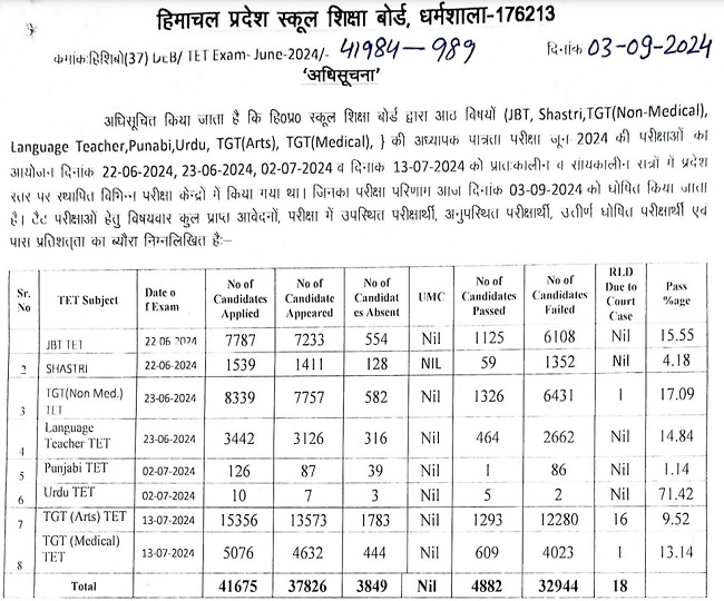 हिमाचल प्रदेश बोर्ड की ओर से जेबीटी टीईटी एवं शास्त्री टीईटी की परीक्षा 22 जून, टीजीटी नॉन मेडिकल और लैंग्वेज टीचर की परीक्षा 23 जून, टीजीटी आर्ट्स एवं टीजीटी मेडिकल की परीक्षा 30 जून को और अंत में पंजाबी एवं उर्दू टीईटी की परीक्षा 2 जुलाई को आयोजित की गई थी।