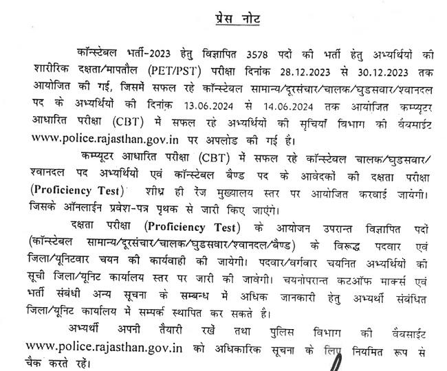 सीबीटी एग्जाम में सफल रहने वाले कॉन्स्टेबल, चालक/ घुड़सवार/ श्वानदल पद एवं कॉन्स्टेबल बैंड के लिए दक्षता परीक्षण शीघ्र ही रेंज मुख्यालय स्तर पर आयोजित करवाई जाएगी। इसके लिए उम्मीदवारों के एडमिट कार्ड अलग से डाउनलोड के लिए उपलब्ध करवाए जाएंगे। एडमिट कार्ड ऑनलाइन माध्यम से वेबसाइट पर जारी किये जायेंगे, ऑफलाइन माध्यम से इन्हें प्रेषित नहीं किया जाएगा। इस भर्ती में माध्यम से कुल 3578 पदों पर नियुक्तियां होनी हैं। भर्ती से जुड़ी विस्तृत डिटेल के लिए अभ्यर्थी ऑफिशियल वेबसाइट पर विजिट कर सकते हैं।