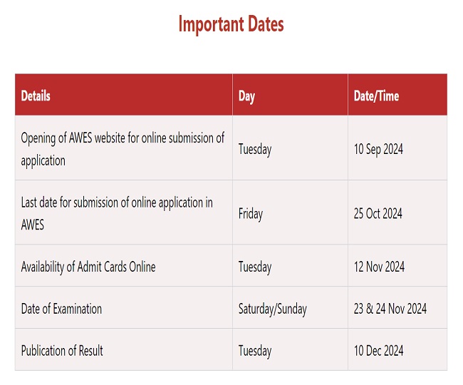 AWES PGT TGT PRT Recruitment 2024 के लिए आवेदन की लास्ट डेट आज यानी 27 अक्टूबर 2024 निर्धारित है। ऐसे में जो भी अभ्यर्थी टीचर बनना चाहते हैं और इस इसके लिए पात्रता पूरी करते हैं वे बिना देरी करते हुए फॉर्म भर लें आज के बाद आवेदन विंडो बंद कर दी जाएगी। स्क्रीनिंग टेस्ट का आयोजन 23 एवं 24 नवंबर को करवाया जाएगा।
