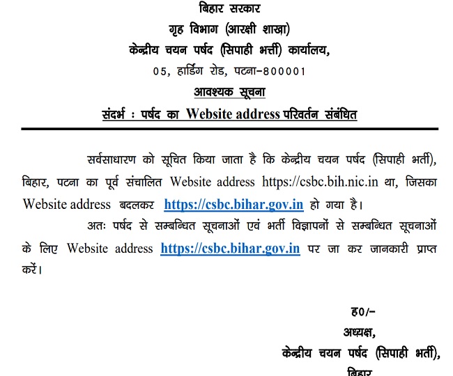अधिसूचना में दी गई जानकारी के मुताबिक वेबसाइट का एड्रेस पहले csbc.bih.nic.in था जिसे अब बदलकर csbc.bihar.gov.in कर दिया गया है। इसके साथ ही नोटिफिकेशन में बताया गया है कि भर्ती से संबंधित नई सूचनाओं या विज्ञापनों के लिए अभ्यर्थियों को इसी वेबसाइट पर विजिट करना होगा।