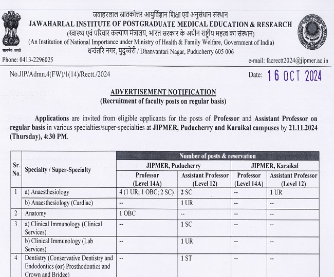 जवाहरलाल इंस्टीट्यूट ऑफ पोस्ट-ग्रेजुएट मेडिकल एजुकेशन एंड रिसर्च (JIPMER), पुडुचेरी एवं कराईकल कैम्पस में प्रोफेसर एवं असिस्टेंट प्रोफेसर के रिक्त पदों पर भर्ती के लिए नोटिफिकेशन जारी किया गया है। इस भर्ती के माध्यम से 80 रिक्त पदों पर नियुक्तियां की जाएंगी। जो भी अभ्यर्थी प्रोफेसर बनने की पात्रता पूरी करते हैं और रेगुलर बेसिस पर नौकरी पाना चाहते हैं उनके लिए यह सुनहरा मौका है। अधिसूचना में दी गई डिटेल के मुताबिक भर्ती के लिए आवेदन प्रक्रिया 25 अक्टूबर से शुरू कर दी जाएगी जो 21 नवंबर तक जारी रहेगी।