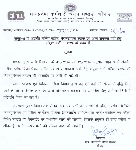 मध्य प्रदेश कर्मचारी चयन बोर्ड (एमपीईएसबी) ने ग्रुप-5 के तहत नर्सिंग स्टाफ, पैरामेडिकल स्टाफ सहित अन्य पदों पर भर्ती निकाली है। इस भर्ती के लिए आवेदन प्रक्रिया 26 नवंबर से शुरू होनी थी जिसमें अब बदलाव किया गया है। जारी नोटिफिकेश के मुताबिक भर्ती के पदों आदि में बढ़ोत्तरी के साथ जल्द ही विस्तृत नोटिफिकेशन जारी कर आवेदन प्रक्रिया शुरू कर दी जाएगी।