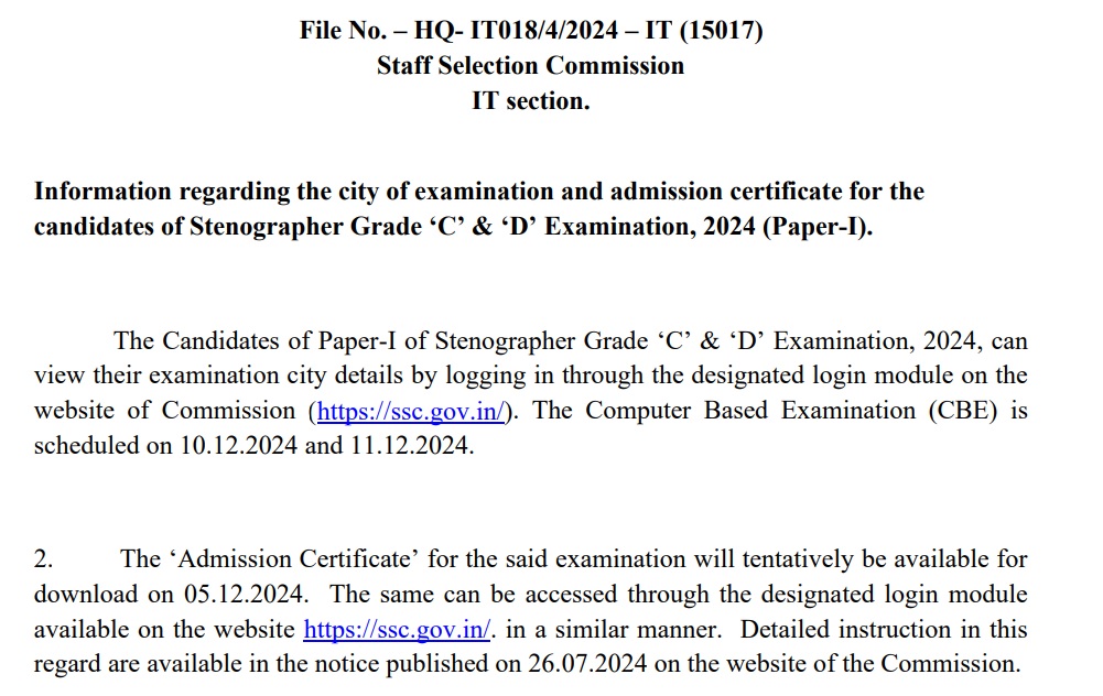 एसएससी की ओर से जारी की गई अधिसूचना के मुताबिक 10 एवं 11 दिसंबर 2024 को होने वाली परीक्षा के लिए आवेदनकर्ताओं के एडमिट कार्ड 5 दिसंबर 2024 को डाउनलोड के लिए उपलब्ध करवा दिए जाएंगे। इसके बाद अभ्यथी लॉग इन क्रेडेंशियल दर्ज करके इसे डाउनलोड कर सकेंगे। अभ्यर्थी ध्यान रखें कि एग्जाम सिटी स्लिप का उपयोग एडमिट कार्ड के रूप में नहीं किया जा सकेगा, इसलिए एडमिट कार्ड जारी होने पर इसे अलग से डाउनलोड करें।