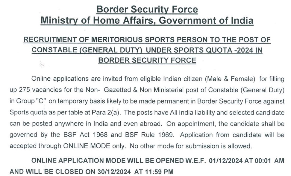 बॉर्डर सिक्योरिटी फोर्स (BSF) में शामिल होने का सपना देख रहे युवाओं के लिए सुनहरा मौका है। बीएसएफ की ओर से स्पोर्ट्स कोटा के तहत जीडी कॉन्स्टेबल पदों पर भर्ती निकाली है। इस भर्ती के लिए ऑनलाइन आवेदन प्रक्रिया शुरू हो चुकी है एवं फॉर्म भरने की लास्ट डेट 30 दिसंबर 2024 तय की गई है। जो भी अभ्यर्थी स्पोर्ट्स कोटा भर्ती के लिए पात्रता पूरी करते हैं वे बीएसएफ की ऑफिशियल वेबसाइट rectt.bsf.gov.in पर जाकर पंजीकरण कर सकते हैं। इस भर्ती के माध्यम से कुल 275 पदों पर नियुक्तियां की जाएंगी।