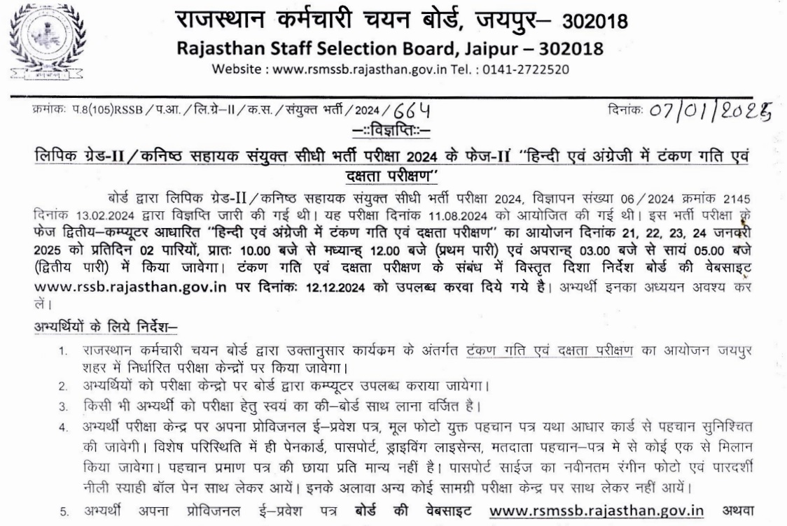 राजस्थान स्टाफ सिलेक्शन बोर्ड (RSMSSB) की ओर से क्लर्क एवं जूनियर असिस्टेंट भर्ती फेज 2 एग्जाम (टाइपिंग टेस्ट एवं प्रोफिशिएंसी टेस्ट) के लिए शेड्यूल की घोषणा कर दी गई है। जो अभ्यर्थी लिखित परीक्षा में सफलता प्राप्त कर चुके हैं वे अब इसमें शामिल हो सकेंगे। नोटिफिकेशन के अनुसार कंप्यूटर आधारित "हिंदी एवं अंग्रेजी में टाइपिंग टेस्ट एवं दक्षता परीक्षण" का आयोजन 21, 22, 23 एवं 24 जनवरी 2025 को करवाया जायेगा।
