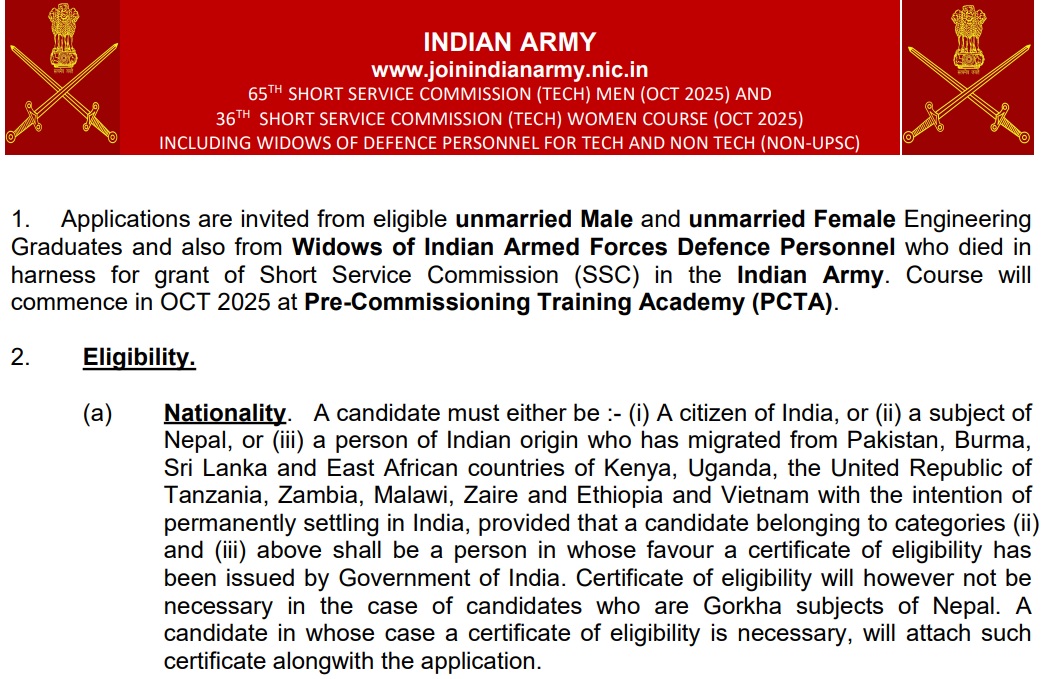 इंडियन आर्मी की ओर से शॉर्ट सर्विस कमीशन (SSC) Tech (65TH SSC (TECH) MEN & 36th SSC (TECH) WOMEN (October 2025) भर्ती के लिए नोटिफिकेशन जारी कर आवेदन प्रक्रिया 7 जनवरी 2025 से शुरू कर दी गई है। जो भी अभ्यर्थी इंडियन आर्मी में शामिल होना चाहते हैं और इस भर्ती के लिए पात्रता पूरी करते हैं वे तुरंत ही भारतीय सेना की ऑफिशियल वेबसाइट joinindianarmy.nic.in पर जाकर आवेदन प्रक्रिया पूर्ण कर सकते हैं। फॉर्म भरने से पहले अभ्यर्थी एक बार पात्रता एवं मापदंड की जांच अवश्य कर लें।