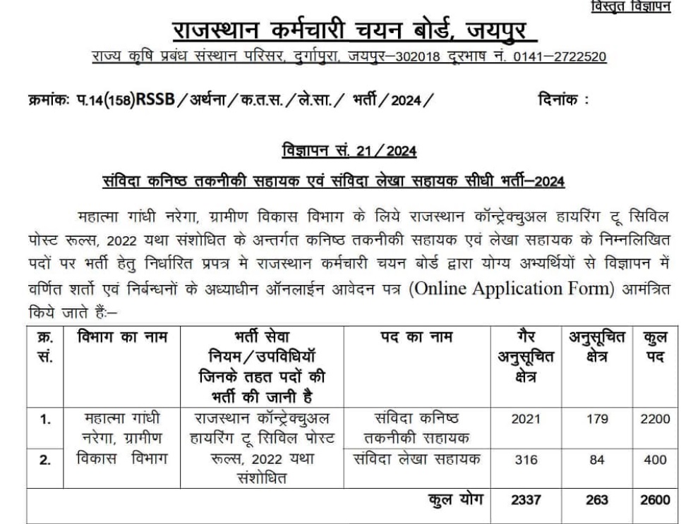 इस भर्ती के माध्यम से आरएसएसबी की ओर से कुल 2600 पदों पर भर्ती की जाएगी। इसमें से गैर अनुसूचित क्षेत्र के लिए 2337 पद और अनुसूचित क्षेत्र के लिए 263 पद आरक्षित हैं। भर्तियां कॉन्ट्रैक्ट के आधार पर की जाएंगी।